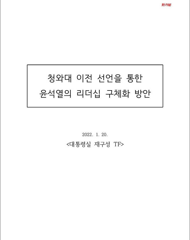 | ▲ 원희룡 전 국토교통부 장관이 10일 자신의 SNS에 공개한 2022년 1월 20일자로 ‘대통령실 재구성 TF’가 작성한 '청와대 이전 선언을 통한 윤석열의 리더십 구체화 방안' 보고서. |