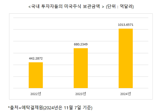 미국 뉴욕증시가 강세장을 보이고 있는 가운데 서학개미(미국주식에 투자하는 국내 투자자들)들의 미국주식 보관금액이 사상 처음으로 1000억달러를 돌파했다.