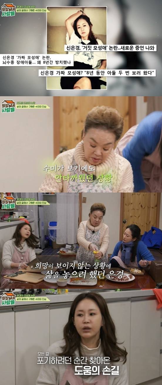 김수미는 "자식을 다른 곳에 버렸다고 하더라. 내가 은경이를 볼 때 (그런 애가) 아닌데 기자들, 패널들이 나와서 얘 하나 놓고 죽이는 거다. 아닌 건 아닌 거다. 은경이에게 얘기도 안 하고 생방송인데 기자에게 연결하라고 했다"라며 후배 신은경을 위해 발벗고 나선 뒷이야기를 털어놓았다.