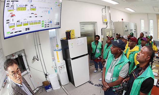 경청 새마을운동 연수에 참여한 파푸아뉴기니 공무원들이 가축분뇨자원화 시설 시스템에 대해 설명을 듣고 있다.