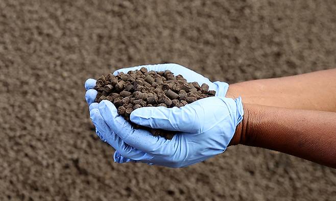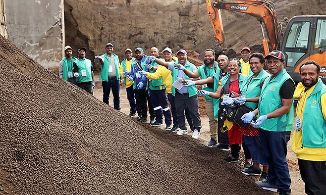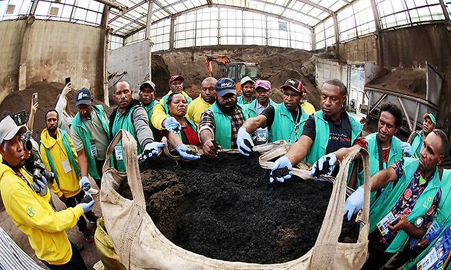 “친환경 퇴비가 참 좋네요” 새마을운동 연수로 충남 공주시 가축분뇨자원화 시설 업체를 방문한 파푸아뉴기니 은가이 베나 주 공무원들이 동물 분뇨를 가공해 재탄생한 친환경 퇴비를 손으로 만져보고 있다.