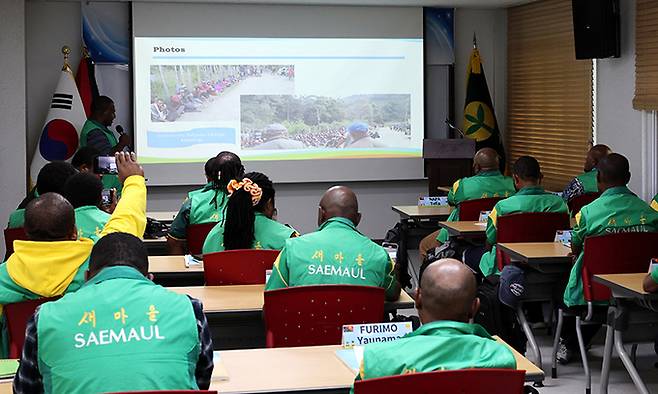 지난달 30일 경기 성남시 분당구 새마을운동중앙연수원 강의실에 1970년대 많이 들었던 ‘새마을 노래’가 구릿빛 외국인 입을 통해 울려 퍼진다. 합창 주인공들은 호주 북쪽의 남태평양 주요 섬나라 파푸아뉴기니의 은가이 베나 주(州)에서 온 공무원 20명. 이들은 새마을운동중앙회가 개발도상국의 새마을사업 추진 역량 강화를 위해 마련한 9박10일간의 연수를 마무리하는 수료식에서 한국어 가사의 새마을 노래를 우렁차게 불렀다.