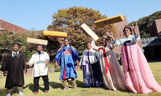 윷놀이 수료식을 앞두고 한복을 차려입은 새마을운동 연수 파푸아뉴기니 공무원들이 윷놀이를 하고 있다.