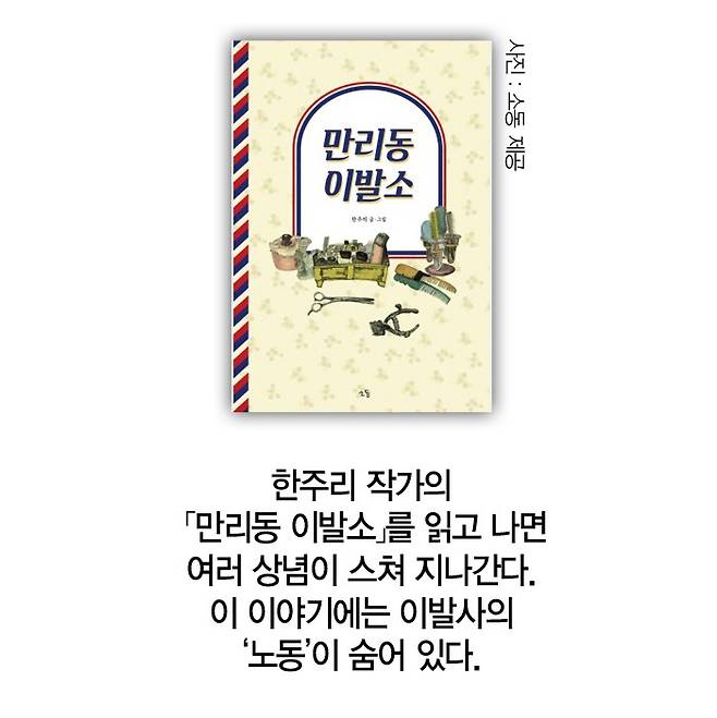 시야에서 사라지니 기억에서도 점차 흐려진다. 하지만 한주리 작가의 「만리동 이발소」를 읽고 나니 여러 상념이 스쳐 지나간다. 그리고 이 이야기에는 이발사의 '노동'이 숨어 있다. 우리가 사는 이곳은 사라져가는 노동도 새롭게 생겨나는 노동도 있다. 수많은 노동 중에 이발사의 노동도 그렇다.