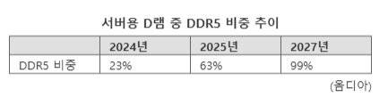 시장조사업체 옴디아에 따르면 전체 서버용 D램에서 DDR5가 차지하는 출하량 비중은 올해 23%에서 내년 63%로 급증할 전망이다. 2027년에는 DDR5 비중이 99%에 달할 것으로 옴디아는 전망했다.