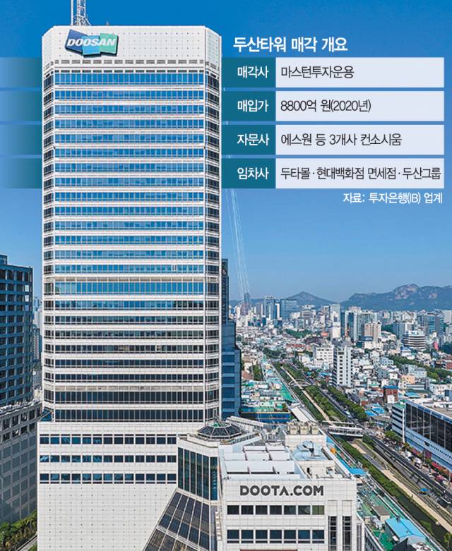 10일 투자은행(IB) 업계에 따르면 마스턴투자운용은 최근 부동산 종합 서비스 기업 에스원 등 3개사 컨소시움을 자문사로 선정하고 두산타워 매각에 본격적으로 나섰다.