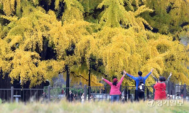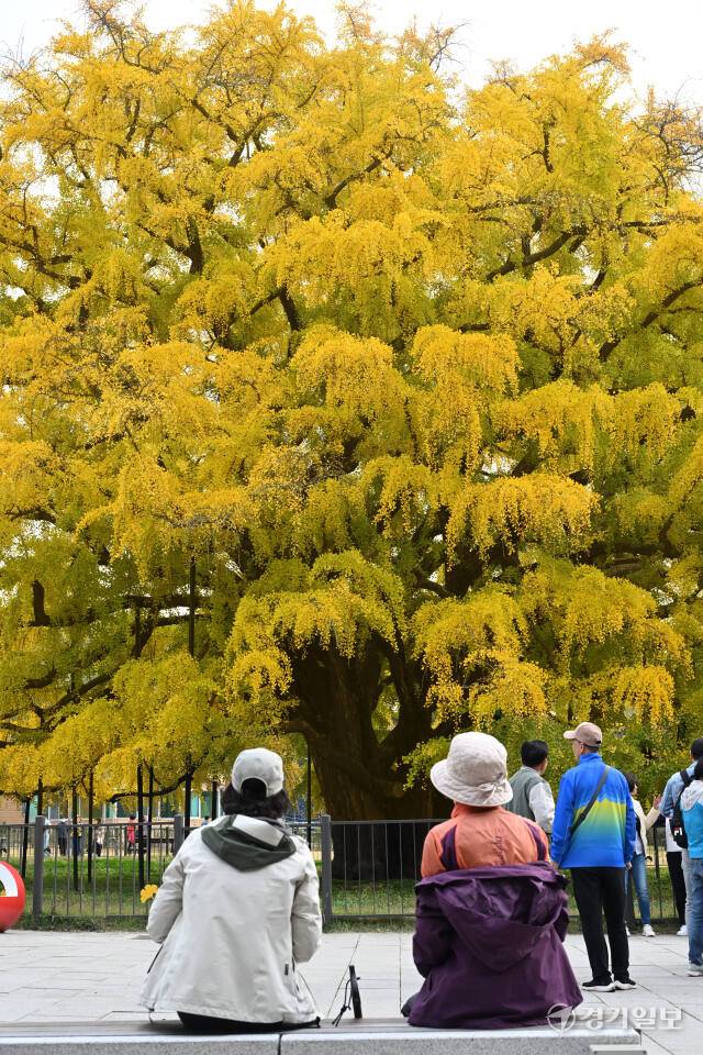 10일 인천 남동구 장수동 은행나무를 찾은 시민들이 노랗게 물든 나뭇잎을 감상하고 있다. 대한민국 천연기념물 제562호인 이 나무는 높이 약 30m, 둘레는 약 8.6m로, 수령은 약 800년으로 추정된다.