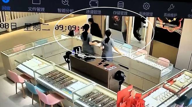 몸을 돌리는가 싶더니 목걸이를 건 채 그대로 상점 밖으로 달아나고, 직원들은 당황해 어쩔 줄 몰라합니다.