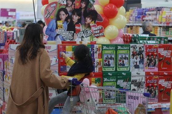 빼빼로데이를 하루 앞둔 10일 서울 한 대형마트에서 시민이 과자를 고르고 있다. 빼빼로데이 시즌인 9~11월에만 빼빼로 연매출의 절반가량이 판매된다. [연합뉴스]