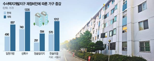다만 일원동 가람·상록수 등의 아파트 단지와 큰길을 두고 마주 보고 있는 푸른·샘터마을과 목련타운 단지는 사업성이 낮아 재건축이 쉽지 않다는 평가가 나온다. 정비계획안에 따르면 재건축 시 고도제한은 105m, 상한 용적률은 250%로 결정된 가운데 푸른·샘터마을과 목련타운 단지의 현재 용적률은 이미 평균 249%에 달하기 때문이다.