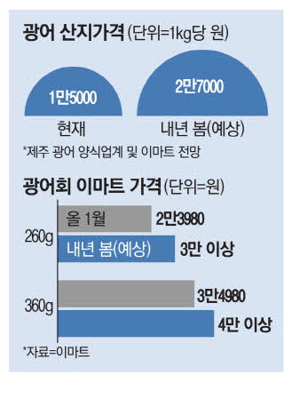 다만 업계에서는 나머지 마트, 소매 시장 전체를 감안한 광어값 폭등은 다가올 현실이라고 받아들이고 있다. 내년에도 무더위가 지속되면 폐사 양식장이 속출해 국산 광어를 보기 더욱 힘들어질 수 있다는 것이다.