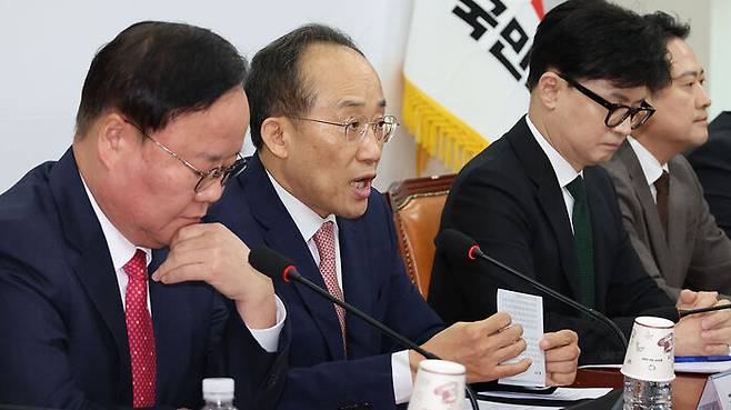 ▲ 국민의힘 추경호 원내대표가 11일 오전 서울 여의도 국회에서 열린 최고위원회의에서 발언하고 있다.