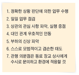 아버지의 글씨는 누가 보아도 명필이다. 그 선명한 필체로 메모지에는 일곱 가지 ‘근무 요령’이 적혀 있었다. 아버지는 특유의 카랑카랑한 목소리로 또박또박 그 의미를 내게 설명했다. 그냥 별생각 없이 읽어봐서 그랬을까. 평범한 이야기처럼 들렸다. 처음에는 그리 가슴에 와닿지 않았는데, 국내 대기업을 비롯해 최고 인재만 모인다는 여러 다국적기업에서 20년 이상의 나름 경쟁력 있는 커리어를 쌓은 지금, 이 시점에서 아버지의 메모를 바라 보노라면, 이렇게 간결하면서도 파워풀한 ‘원칙과 철학’이 있을까 하는 생각에 무릎을 치게 된다. 지나간 커리어의 여정에서 수십억, 수백억원의 연봉을 받는 많은 프로를 보았지만, 이 일곱 가지를 일상에서 철저히 실천하는 사람을 생각만큼 그리 많이 만나지는 못했기 때문이다. 더욱이 짧지 않은 시간을 기업에서 인사 책임자로 일했던 내 입장에서는 중년의 나이를 훌쩍 넘긴 요즘 들어서 오히려 더 아버지 메모의 ‘숨어있는’ 가치를 새삼 느끼곤 한다.