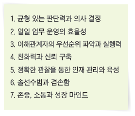 ‘인사쟁이’라는 직업병 때문에 ‘아버지 커리어 노트’의 일곱 가지 당부 사항을 인사관리(HR)에서 강조하는 핵심 역량으로 기술을 해보니 표와 같이 재정의할 수 있었다.