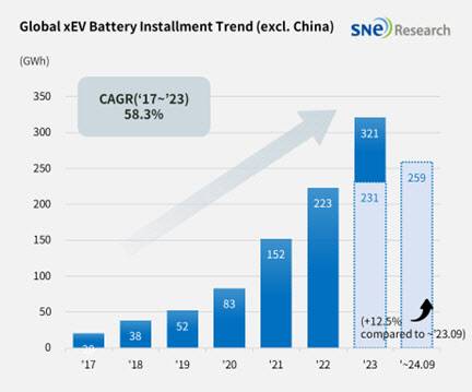 올해 3분기까지(1~9월) 글로벌 전기차용 배터리 시장에서 중국 을 제외한 지역의 배터리 사용량이 전년 대비 12.5% 성장한 258.7기가와트시(GWh)를 기록했다.