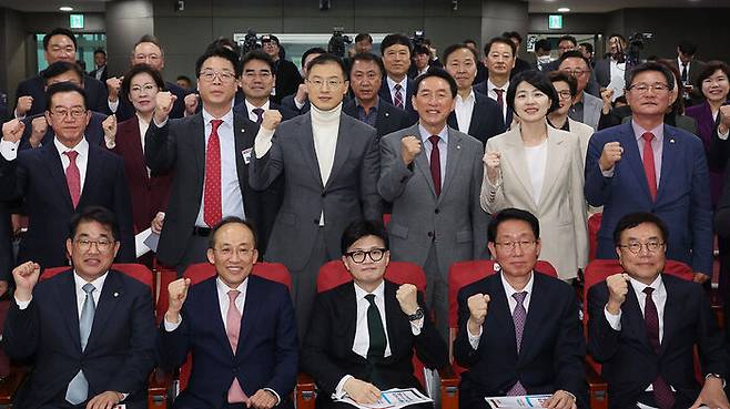 ▲ 11일 국회 의원회관에서 열린 '국민의힘-윤석열 정부 합동 전반기 국정성과 보고 및 향후 과제 토론회'에서 한동훈 대표와 추경호 원내대표 등이 기념 촬영을 하고 있다.