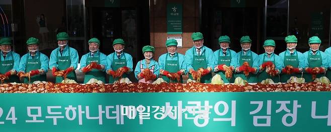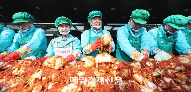 함영주 하나금융지주 회장(가운데)과 임직원들이 11일 서울 중구 하나금융그룹 명동사옥에서 열린 ‘2024 모두하나데이 사랑의 김장나눔’ 행사에서 김장을 하고 있다. 올해로 14번째를 맞이하는 ‘모두하나데이’는 하나금융그룹의 대표적인 ESG 활동으로 이날 담근 1만 1111포기 김장 김치는 소외 계층에 전달된다. 2024.11.11 [한주형기자]
