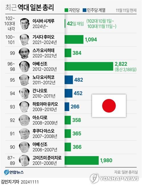 (서울=연합뉴스) 김민지 원형민 기자 = 일본 집권 자민당 총재인 이시바 시게루 총리가 지난달 1일 취임 이후 40여일 만에 11일 총리로 재선출됐다.