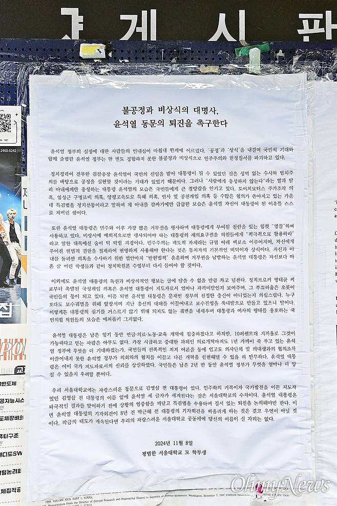 김건희 여사 봐주기 수사 논란, 명태균씨 국정개입 의혹 등으로 윤석열 대통령의 퇴진을 촉구하는 목소리가 대학가 곳곳에서 번지는 가운데, 윤 대통령의 모교인 서울대에도 "윤석열 대통령의 퇴진을 촉구한다"라는 내용의 대자보가 붙었다.