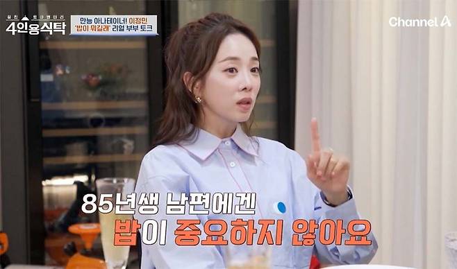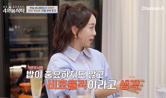 [TV리포트=홍진혁 기자] 아나운서 박은영이 결혼 생활 중 남편에게 밥을 차리며 사랑을 표하고 싶었지만 비효율적이라며 밥을 사먹자고 한 사업가 남편에게 서운함을 드러냈다. 11일 선공개 된 채널A '4인용식탁'에서 유부녀 강수정, 박은영, 이정민, 현영은 '남편 밥'을 주제로 담소를 나눴다.
