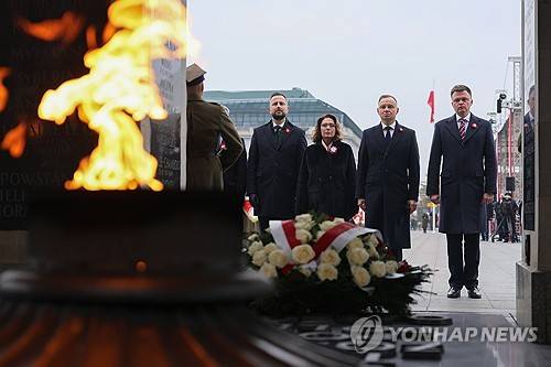 epa11714524 (L-R) Polish Defence Minister Wladyslaw Kosiniak-Kamysz, Polish Senate Speaker Malgorzata Kidawa-Blonska, Polish President Andrzej Duda and Polish Sejm Speaker Szymon Holownia lay a wreath at the Tomb of the Unknown Soldier at Pilsudski Square during the Independence Day celebrations in Warsaw, Poland, 11 November 2024. National Independence Day commemorates the anniversary of the restoration of Poland's sovereignty as the Second Polish Republic in 1918 from the German, Austro-Hungarian and Russian Empires. EPA/PAWEL SUPERNAK POLAND OUT