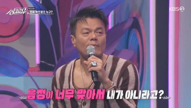 이날 '싱크로유' 1라운드 드림 아티스트는 박진영이었다. 1번 박진영은 박지윤의 '성인식', 2번 박진영은 '허니', 3번 박진영은 2PM의 '어게인 앤 어게인(Again & Again)'을 노래했다. '성인식'을 원키로 소화한 1번 박진영은 추리단과 객석 모두 AI라고 추측했다. 5표로 역대 최소 득표를 받은 상황. 하지만 모두가 아니라고 생각했던 1번 박진영은 진짜였다.