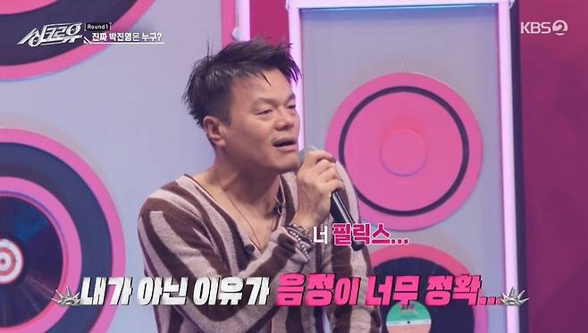박진영은 추리단 얘기에 대해 "일단 필릭스에 대해서 얘기해야 할 것 같다. 음정이 너무 맞아서 내가 아니라고?"라고 흥분했다.