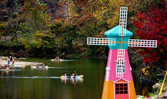 평년 기온을 웃도는 포근한 날씨를 보인 10일 충남 논산시 벌곡면 하천을 찾은 시민들이 카약을 타며 늦가을 정취를 느끼고 있다.