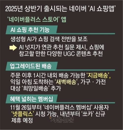 네이버가 내년 상반기 인공지능(AI) 기능이 강화된 새 쇼핑 애플리케이션(네이버플러스 스토어) 출시를 예고했다. 국내 이커머스 강자인 쿠팡을 겨냥한 듯 네이버플러스 멤버십 혜택을 확대하고 ‘오늘 배송’과 ‘새벽 배송’, ‘내일 배송’ 등 배송 서비스를 강화한다. 다만 네이버 측은 “쿠팡과는 가는 길이 다르다”고 했다.