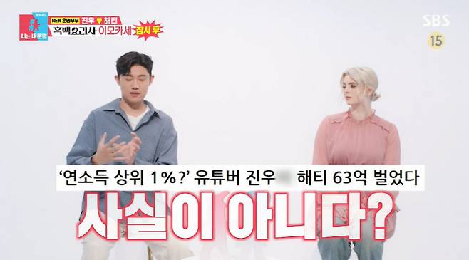 [스포츠조선닷컴 정안지 기자] '900만 유튜버' 진우, 해티 부부가 '63억'으로 알려진 연소득에 대해 해명했다.