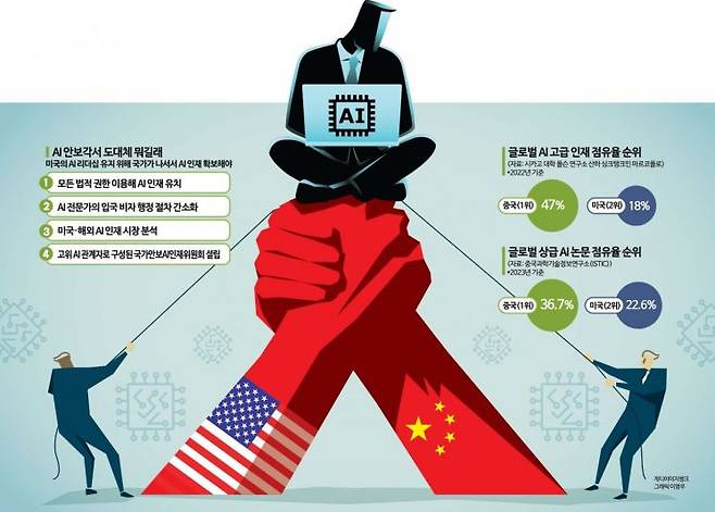 하지만 AI 고급 인재가 미국보다 중국에서 더 많이 배출되고 있어 미국 발등에 불이 떨어졌다. 시카고대 폴슨 연구소 산하 싱크탱크인 마르코폴로의 ‘글로벌 AI 인재 추적’에 따르면 2022년 기준 전 세계 AI 고급 인재 점유율은 중국이 47%로 1위다. 미국은 18%로 그 뒤를 잇지만, 중국의 절반 수준에도 못 미치는 상황이다.