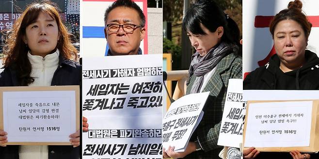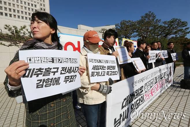 <오마이뉴스>는 지난 6일 대법원 앞에서 남씨 일당의 엄벌을 촉구하는 기자회견을 진행한 피해대책위 안상미(46) 위원장, 강민석(55)·박순남(49)·최은선(43) 부위원장을 만났다. 2시간 동안 진행된 인터뷰에서 이들은 "이 재판의 결과는 또 다른 전세사기 사건들의 결과를 좌우할 수 있어 중요하다"고 강조했다. 더해 "최근 사건에 대한 관심이 많이 줄어든 것을 체감한다"며 "누구나 전세사기를 당할 수 있는 잠재적 피해자이니 관심을 가져달라"고 당부했다.