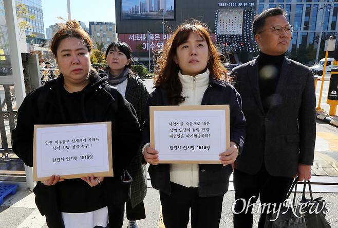 | ▲ 인천 미추홀구 전세사기 피해대책위 지난 6일 서초구 대법원 앞에서 '인천 미추홀구 남OO 일당 엄벌 촉구 및 탄원서 제출 기자회견'이 열렸다. 이날 법원에 제출할 탄원서를 들고 선 인천 미추홀구 전세사기 피해대책위 최은선 부위원장, 박순남 부위원장, 안상미 위원장, 김태근 민변 민생경제위원장(왼쪽부터)의 모습. |