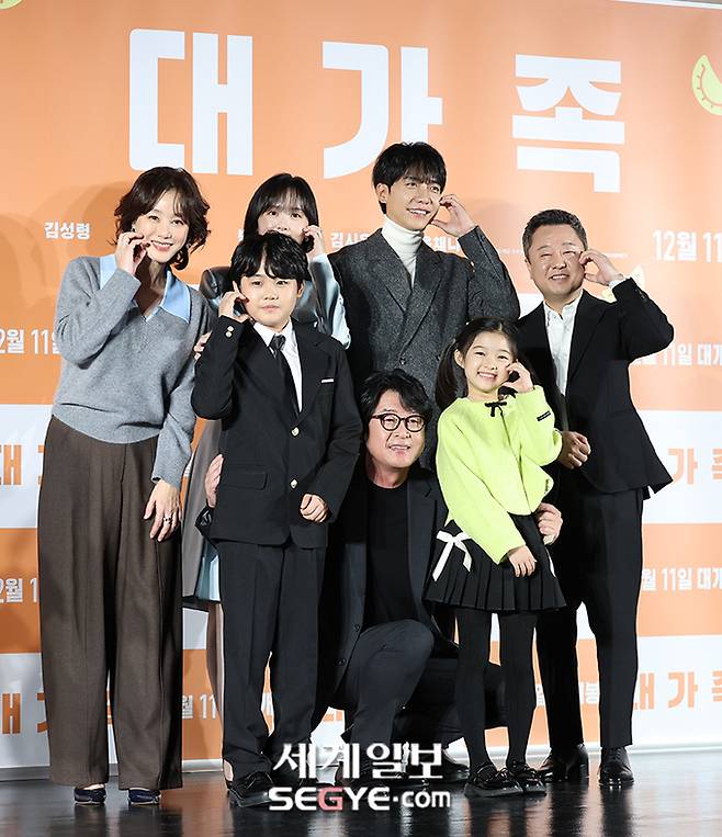 배우 김성령, 강한나, 이승기, 박수영, 김시우, 김윤석, 윤채나가 12일 오전 서울 롯데시네마 건대점에서 열린 영화 '대가족'의 제작보고회에 참석해 포즈를 취하고 있다.