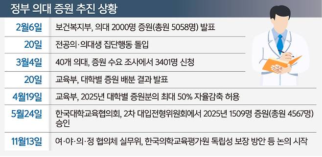 정부도 당장 증원 조정을 선뜻 받아들이긴 어렵다. 교육부는 2025학년도 모집인원 변경은 불가능하다는 입장을 고수하고 있다. 교육부 관계자는 “모레 대학수학능력시험이고 수험생들은 수능이 끝나면 대학별 고사, 정시모집 준비 등에 들어가는 상황에서 모집인원을 바꾸기 어렵다”며 “협상 테이블에서 논의해볼 수는 있지만 2025학년도를 바꾸는 것은 불가능하다. 2026학년도를 얘기하는 것이 현실적”이라고 말했다.