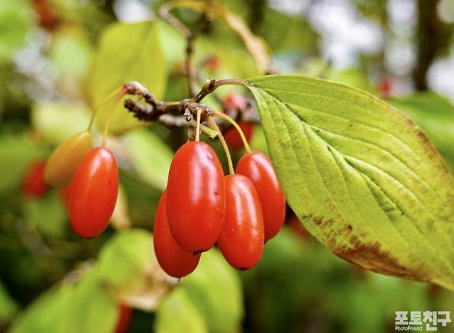 산수유나무 열매는 윤기가 나는 선홍색으로 익어갑니다.