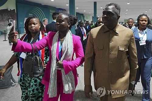 A woman holds a phone as she walks with Liberia Vice President Jeremiah Koung through the COP29 U.N. Climate Summit, Tuesday, Nov. 12, 2024, in Baku, Azerbaijan. (AP Photo/Peter Dejong)