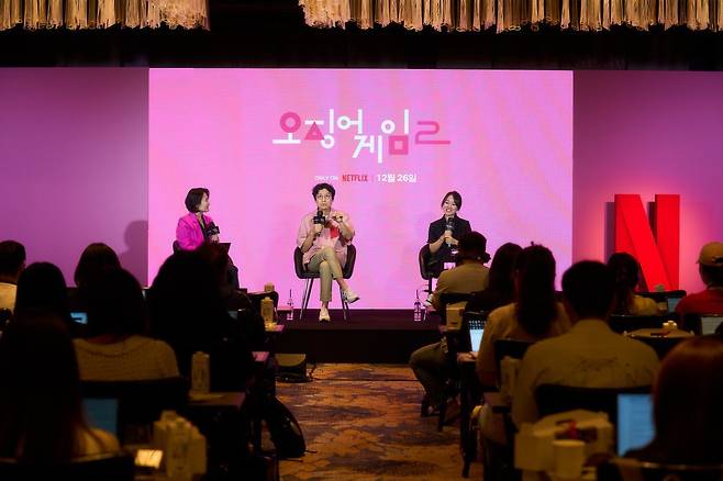 지난 8월 1일 오후 서울 종로구 새문안로 포시즌스 호텔 서울 누리 볼룸에서 진행된 넷플릭스 시리즈 ‘오징어게임’ 새 시즌 기자간담회. 이날 행사는 엠바고(보도유예) 끝에 약 3개월 만에 정식 공개됐다.