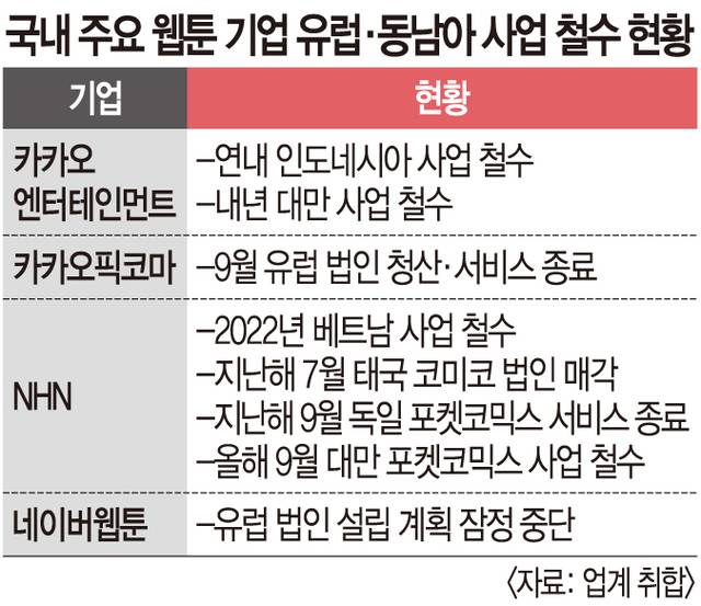 NHN은 최근 대만 웹툰 서비스 ‘포켓코믹스’를 종료하면서 동남아 시장에서 웹툰 사업을 완전히 접었다. NHN은 2022년 베트남 사업을 철수하고 지난해 7월엔 태국 코미코 법인도 매각했다. 두 달 뒤인 지난해 9월 독일에서도 포켓코믹스 서비스를 종료했다. 네이버웹툰도 2022년부터 추진하던 유럽 법인 설립을 잠정 중단한 상황이다.