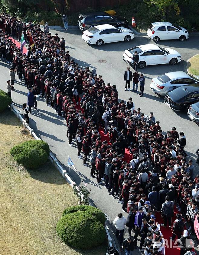 [서울=뉴시스] 고범준 기자 = 2025학년도 대학수학능력시험을 하루 앞둔 13일 오전 서울 종로구 중앙고등학교에서 열린 수능 수험표 배부 및 장행식에서 수험생들이 교사 및 재학생들의 축하를 받으며 학교를 나서고 있다. 2024.11.13. bjko@newsis.com