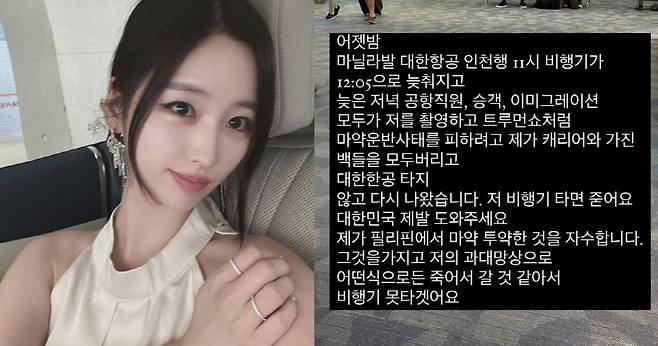 이어 김나정은 "어젯밤 마닐라발 비행기가 늦춰 지고 늦은 저녁 공항 직원, 승객, 이미그레이션 모두가 나를 촬영하고 트루먼쇼처럼 마약 운반 사태를 피하려고 내가 캐리어와 가진 백들을 모두 버렸다"며 "비행기를 타지 않고 다시 나왔다. 비행기 타면 죽는다. 대한민국 제발 도와달라"며 횡설수설 글을 올렸다.