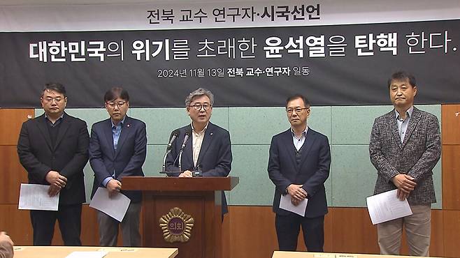 전북지역 교수와 연구자 125명은 오늘 도의회에서 기자회견을 열어 "윤석열 대통령은 무능력과 무책임, 부도덕함으로 국가를 위기로 몰아넣고 있어 더 이상 대통령으로 인정할 수 없다"며 즉각적인 퇴진을 요구했습니다.