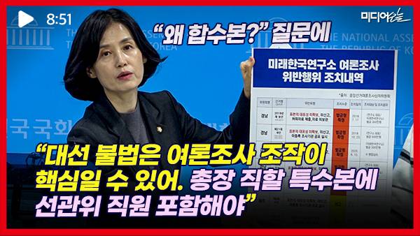 “이걸 서울로 올려서 합동수사본부를 꾸리고 이렇게 해야 한다고 하셨는데 이걸 하려면 어디가 움직여야 하느냐?”는 질문엔 “검찰총장이 결심하면 되는 사안이고, 특수본이나 특수단을 꾸리는 것은 법무부 장관이 승인하면 되는 사안”이라며 “이 사건은 이제 창원의 선거 사건이 아니기 때문에 총장이 자신의 책임으로 직할로 수사본부를 꾸리고 특히 지난 대선의 불법은 여론조사 조작이 핵심일 수도 있기 때문에 특수본에서 그 부분을 집중적으로 수사해야 한다”고 설명했다. 영상엔 박은정 의원의 백브리핑 내용이 담겨있다.