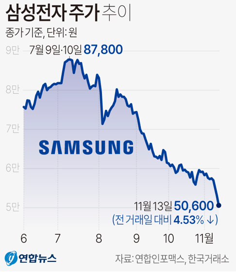 특히 대장주인 삼성전자 주가는 4.53% 하락한 5만 600원으로 5만 원 선마저 위협받게 됐습니다. 이달 들어서만 삼성전자의 주가는 13.21% 미끄러졌습니다.