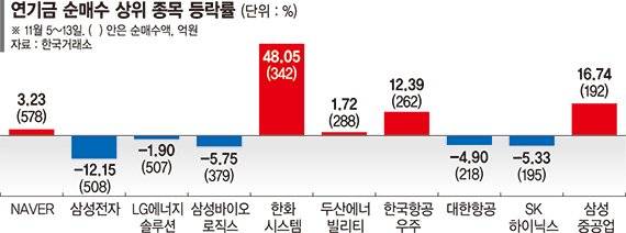 연기금이 미국 대선 이후 가장 많이 순매수한 종목은 NAVER(578억원), 삼성전자(508억원), LG에너지솔루션(507억원), 삼성바이오로직스(379억원), 한화시스템(342억원), 두산에너빌리티(288억원), 한국항공우주(262억원), 대한항공(218억원), SK하이닉스(195억원), 삼성중공업(192억원) 등 순이었다.