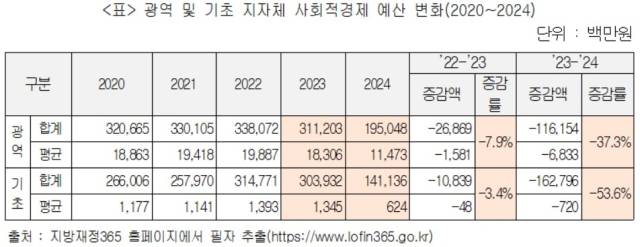 아래 표는 현 정부가 본격적인 예산을 세운 2024년 광역과 기초의 예산 감소율이다. '지방재정365 홈페이지'에서 키워드 검색으로 추출하여 분석한 결과 광역이 37.3%가 줄었고, 기초는 53.6%가 줄었다. 절반 이상 줄어든 수치다. 중앙부처 관련예산안이 56.3% 감소했으니 지방정부 사회적경제 예산 감축을 주도한 꼴이다.