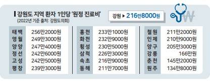 지역 내 상급병원이 없는 등 의료체계가 제대로 갖춰지지 않은 곳일수록 진료비용이 높아졌다. 본지가 도내 18개 시·군별 1인당 평균 진료비(타 시·도 및 타 시·군)를 계산한 결과, 태백시의 1인당 원정 진료비는 256만2000원으로 전체 시군 중 가장 높았다. 이어 영월군 249만원, 양양군 247만원, 정선군과 고성군 242만원 순이다.