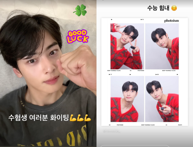 직접 SNS에 글을 남기며 수험생을 응원한 스타들도 있다. 차은우는 13일 개인 인스타그램에 “수험생 여러분 화이팅”이라는 멘트와 함께 ‘네잎클로버’, ‘GOOD LUCK’ 스티커를 덧붙였다. 차은우도 주먹을 꽉 쥔 채 카메라를 응시하는 모습이 담긴 사진을 올리며 수험생을 응원했다.