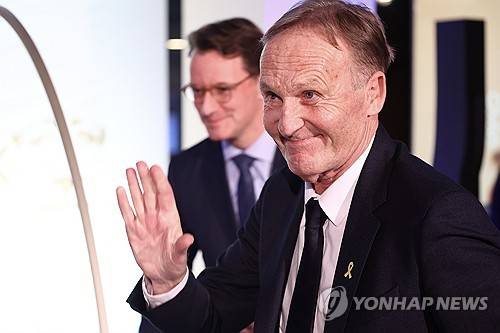 epa11719119 CEO of Borussia Dortmund Hans-Joachim Watzke (R) reacts after receiving the Leo Baeck Prize during the awarding ceremony in Berlin, Germany, 13 November 2024. The prize is reminiscent of Rabbi Leo Baeck. Since 1957, the Central Council of Jews in Germany honors personalities who have rendered outstanding services to the Jewish community. EPA/FILIP SINGER