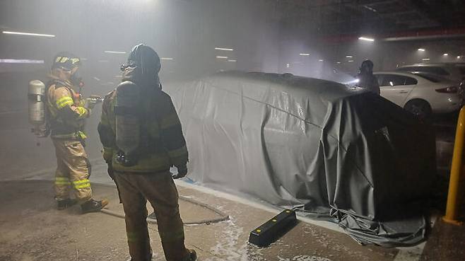 ▲ 불난 전기차 질식소화포로 덮은 소방대원들